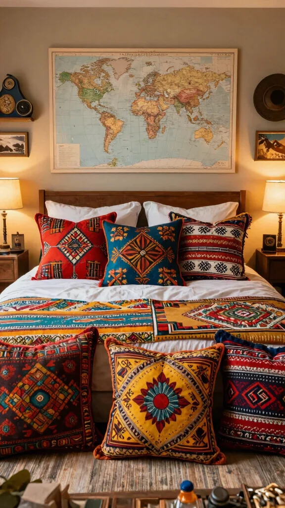 Travel-inspired decor makes a bedroom feel lived-in and curious. Your throw pillows bedroom arrangement can spark conversations—mix ethnic prints with calmer tones to strike balance, turning your travels into a cozy, stylish retreat.