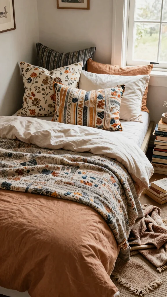 For a Bohemian throw pillow arrangement that reads as cozy bedroom ideas, mix earthy neutrals with pops of saturated color and varied textures.