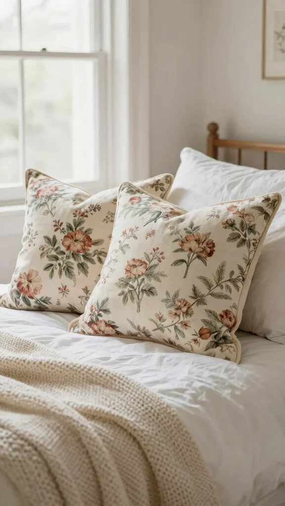 Vintage floral print throw pillows can infuse your bedroom with nostalgia and charm. These pillows often feature intricate designs that add warmth and character to your decor. Picture soft floral patterns enhancing a romantic atmosphere on your bed.
