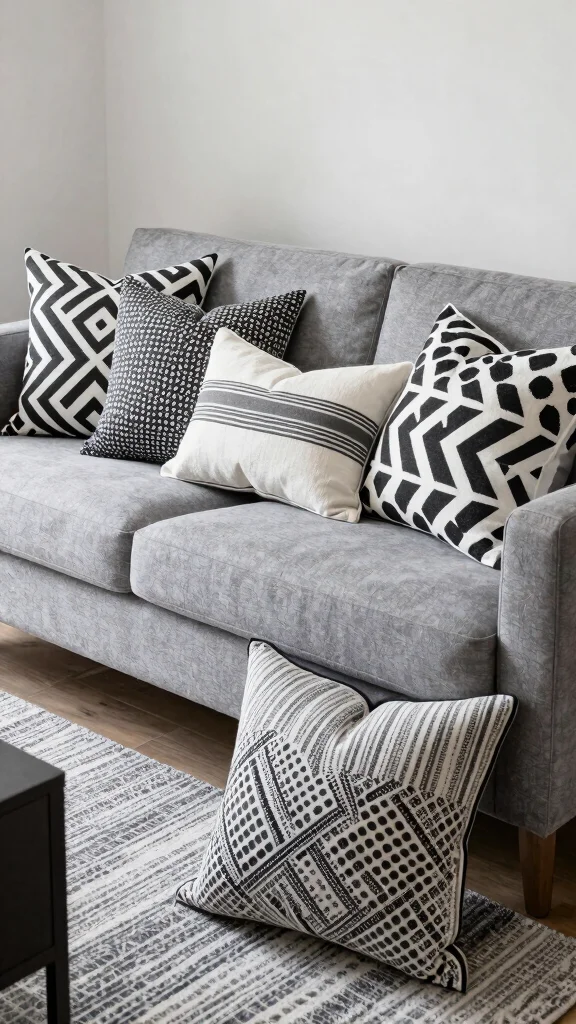 If you love patterns but prefer a simplified look, monochrome patterns are the perfect solution. Opt for black and white or shades of grey to create striking visuals that won’t overwhelm your grey couch. Geometric designs, stripes, or even polka dots in a monochromatic palette can add modern sophistication. Arranging these pillows in a thoughtful way creates an appealing layout, enhancing your living space’s overall aesthetic. Extending similar hues to other decor elements, like rugs or wall art, can unify the room’s design.