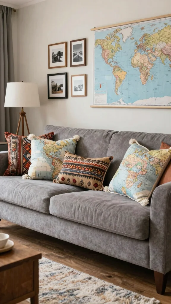Pillows adorned with maps, landmarks, or ethnic patterns can give your grey couch a distinctive flair. Pair these travel-themed pillows with neutral options to create a balanced and inviting look.