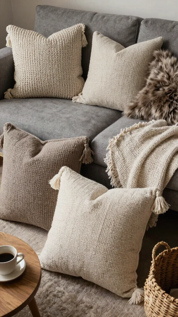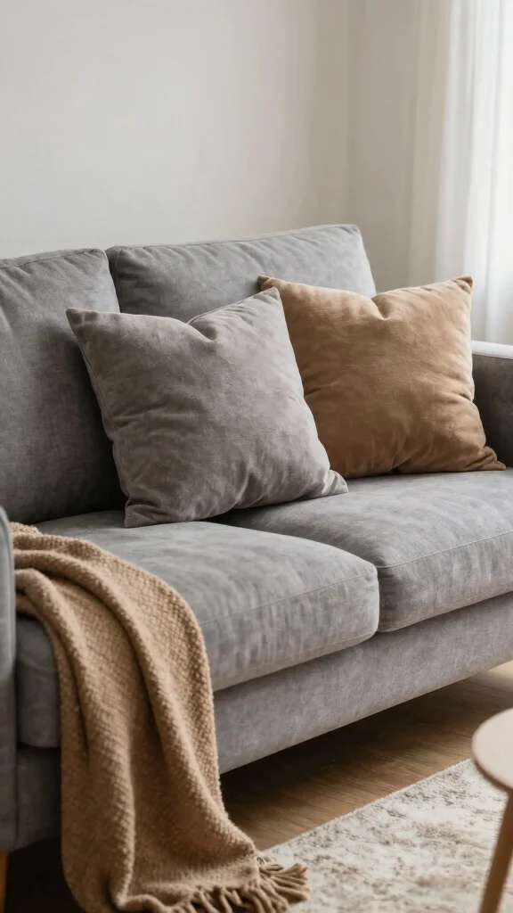 With a grey couch, warm neutrals (cream, taupe) and earthy tones (sage, terracotta) brighten the room without clashing. Add texture with bouclé, velvet, linen, or hemp-weave pillow covers to create depth and cozy home accents without adding noise. Use a maximum of 3–4 colors to keep the grey couch decor calm; then introduce a pop of color through a single decorative pillow in your eco-friendly stack for living room accessories that feel intentional. For throw pillows living room grey couch setups, balance soft fabrics with a few subtle patterns to keep things inviting.