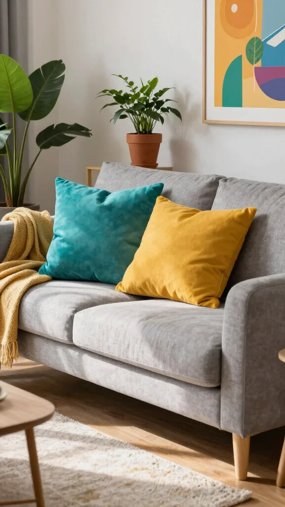 Don’t hesitate to infuse vibrant colors into your throw pillows against the neutral backdrop of a grey couch. Bright hues like mustard, teal, or blush can create a striking contrast that energizes your living space. Colorful pillows serve as the perfect expression of your personality and can turn a simple couch into a statement piece.