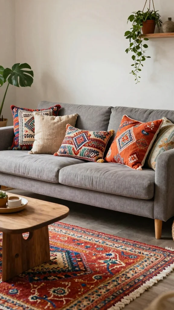 If you appreciate a relaxed and free-spirited vibe, bohemian-style throw pillows are the way to go. Look for designs featuring embroidery, patchwork, or vibrant patterns that express a carefree aesthetic. Layering these unique pillows on your grey couch allows you to showcase your personality while creating an inviting and eclectic space.