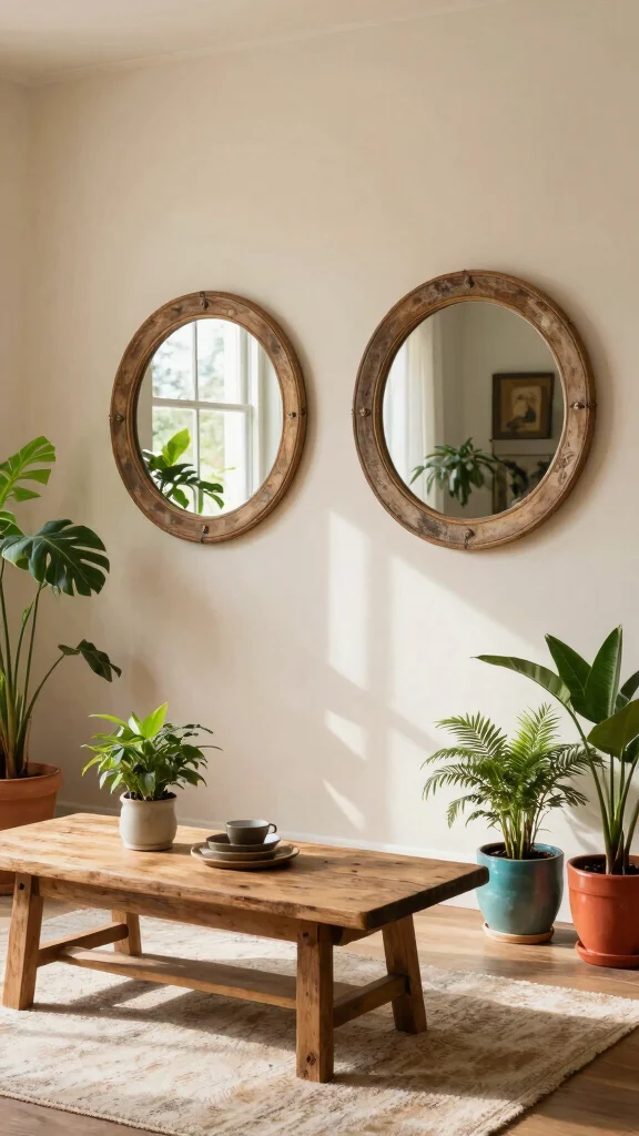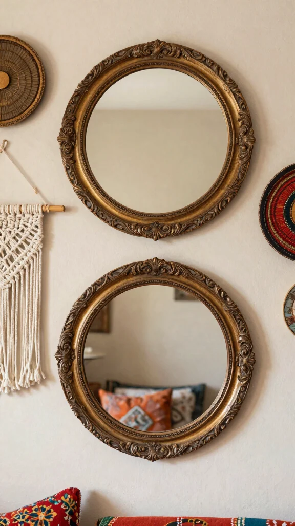 For a bohemian twist, layer two round mirrors within larger frames or decorative arrangements.