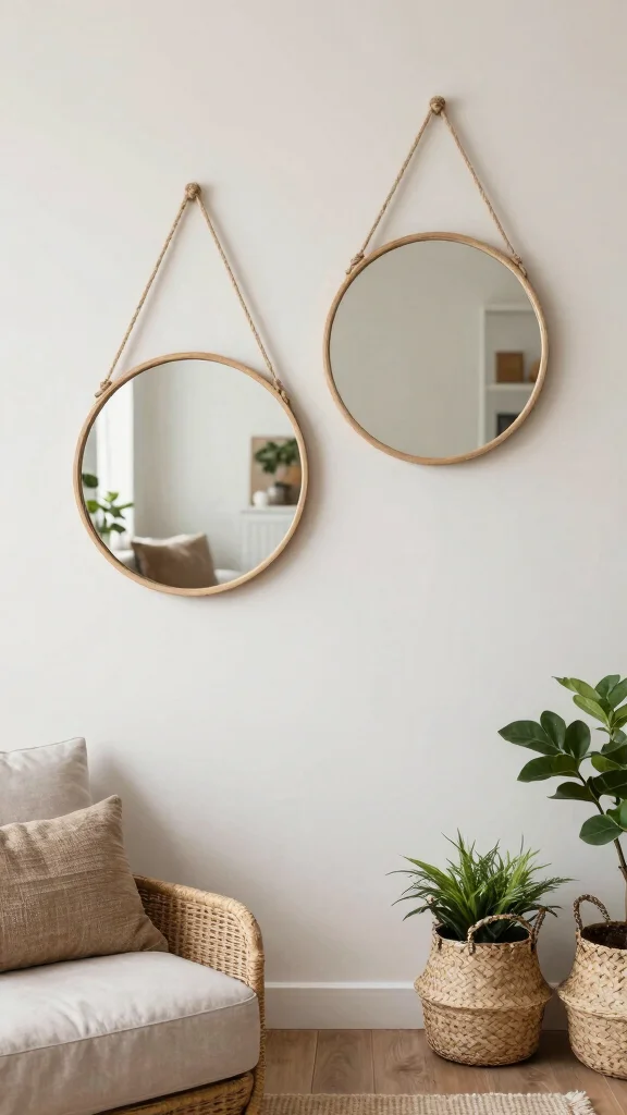 For a laid-back bohemian style, try hanging two round mirrors using ropes or leather straps.