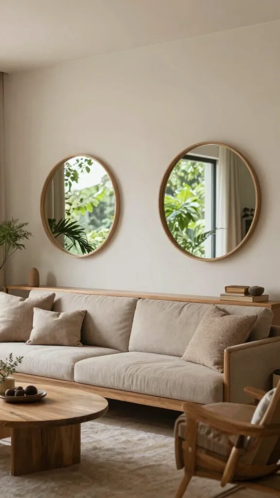 Position two round mirrors to reflect outdoor views or indoor greenery for a fresh feel.