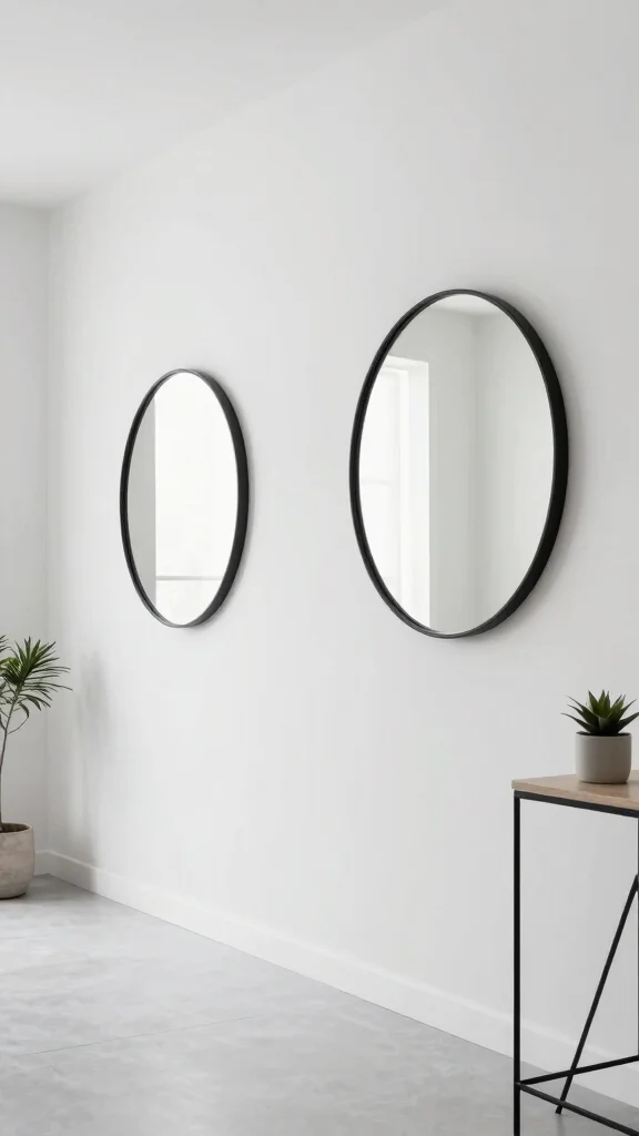 Two simple round mirrors with thin black frames hung against a white wall create a striking visual without overwhelming the space. This setup shines in modern interiors, reflecting light and making the area feel more expansive.