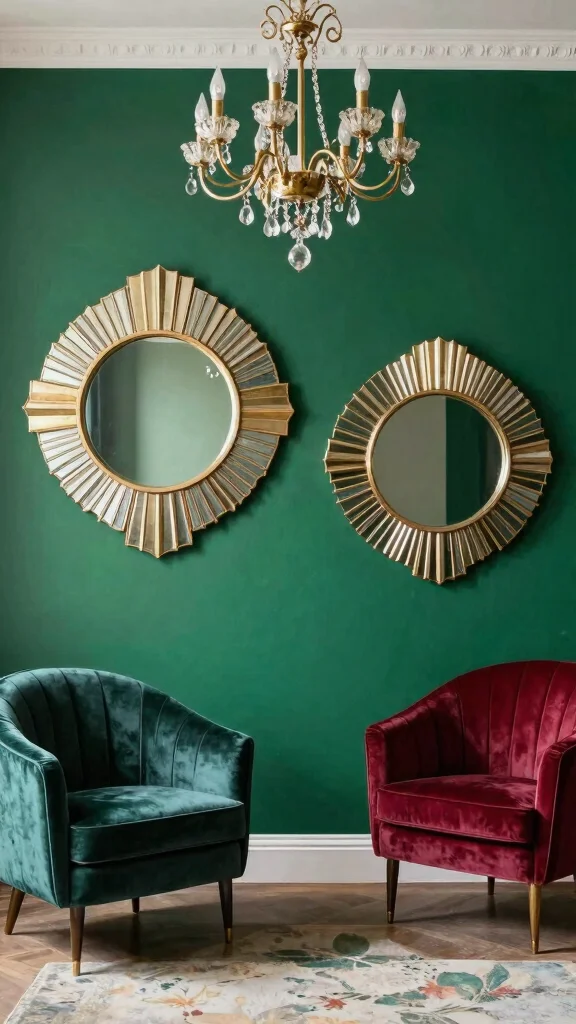 Two round mirrors on wall add instant glamour—Art Deco lines meet modern texture. Mix intricate detailing with velvet accents for a chic living room or hallway. Pro tip: pair bold frames with metallic touches for maximum impact.